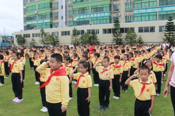 最后,在少先隊(duì)大隊(duì)輔導(dǎo)員何克洋老師帶領(lǐng)下,在莊嚴(yán)的隊(duì)旗下,新少先隊(duì)員們高高地舉起右手進(jìn)行呼號!在《退旗曲》中結(jié)束了此次入隊(duì)儀式。整個入隊(duì)儀式規(guī)范、有序,洋溢著濃濃的溫暖之情,孩子們無比幸福和自豪的眼神告訴我們, 他們定會不忘初心,牢記歷史使命,全面發(fā)展,茁壯成長。