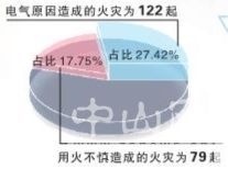 據(jù)統(tǒng)計(jì),由于電器原因引發(fā)的火災(zāi)占比較大。主要表現(xiàn)為:安裝電器線路不符合規(guī)范標(biāo)準(zhǔn),電器超負(fù)荷使用,導(dǎo)線之間連接不牢固,插頭松動(dòng),電線陳舊老化、破損,年久未修換導(dǎo)致短路起火。電熱器或燈泡與可燃物距離過小或使用時(shí)間過長(zhǎng)烤燃可燃物。