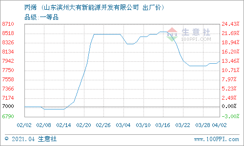 4月2日,山東濱州大有新能源開發(fā)有限公司丙烯最新報價上調(diào),漲50元/噸至7950元/噸。