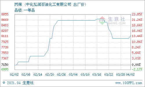 4月2日,中化弘潤石油化工有限公司丙烯報價上調(diào),漲100元/噸至8150元/噸。