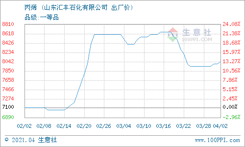 4月2日,山東匯豐石化有限公司丙烯最新報(bào)價(jià)上調(diào),漲50元/噸至8050元/噸。