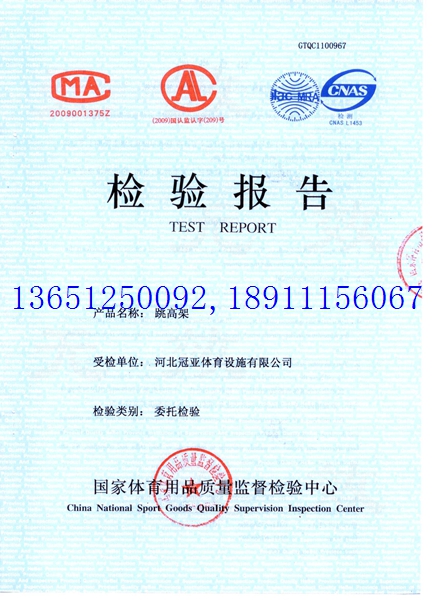 立柱應(yīng)垂直場面,垂直公差不大于1/800,其高度刻度應(yīng)精確、清晰,兩立柱高度刻度應(yīng)對稱;跳高架應(yīng)超過橫桿實(shí)際提升高度100mm;橫桿采用不易折斷的玻璃鋼纖維材料制成;除兩端外,橫桿橫截面是圓形,橫桿顏色醒目,表面無毛刺,所有棱邊和尖角半徑6mm;橫桿固定在立桿上,中心自然下垂20mm;橫桿托能牢固地固定在立柱的刻度內(nèi),橫桿托上沒有包裹橡膠或其他能夠增大與橫桿之間摩擦力的任何物質(zhì),亦沒有使用任何各類的彈簧,進(jìn)行跳高運(yùn)動(dòng)時(shí),碰觸橫桿,橫桿容易掉下。