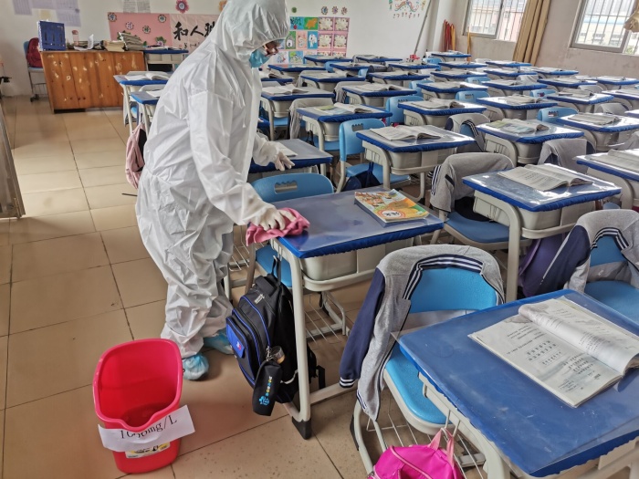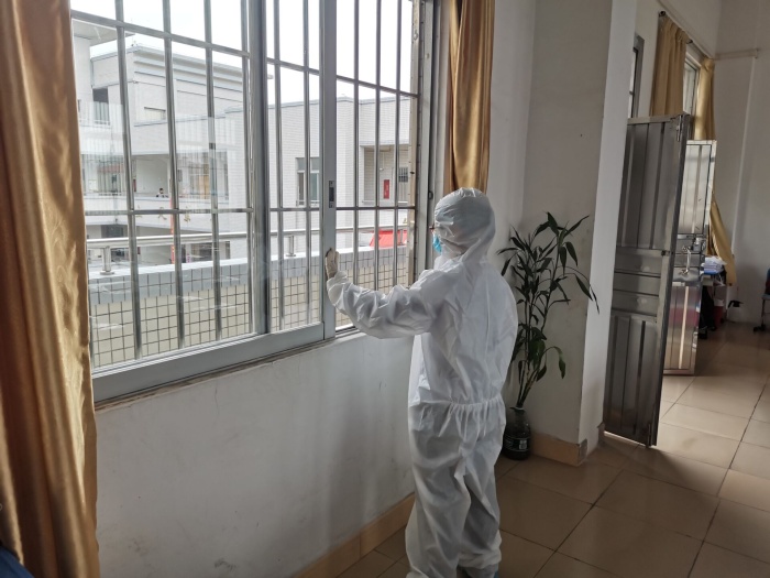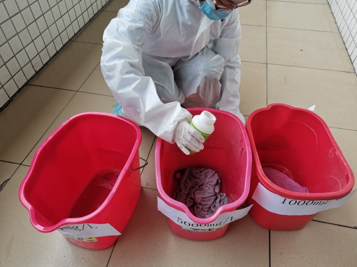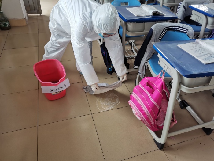 本次演練以如何處置嘔吐物為主,班主任和學生代表、吳醫(yī)生在譚主任的組織下,有序地進行個人防護用品的穿戴,包括佩戴口罩、穿好隔離衣、戴好一次性手套和帽子等,隨后將清潔吸附巾覆蓋在嘔吐物等污物上,接著將污濁吸附巾放入原包裝袋密封丟入廢物袋中,再取出濕巾由干凈區(qū)到污濁區(qū)從外至里螺旋式擦拭,至中心區(qū)域后收緊濕巾丟入廢物袋,消毒完成后,依次脫去防護用具。