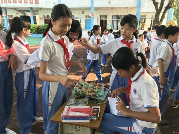 聽,鳳凰樹下的小舞臺上,一曲動聽的《萬眾一心跟黨走》吸引了不少圍觀的同學(xué)們。咸水歌表演的同學(xué)們娓娓動聽的歌聲贏得了觀眾們的陣陣掌聲。講革命故事的同學(xué)們準(zhǔn)備充 分,《王二小》、《董存瑞舍身炸暗堡》……一個個偉大革命先烈的形象深入同學(xué)們的心中??矗止ぶ谱?、書法繪畫展示的同學(xué)們也不甘示弱,一個個精美的手工作品、一幅幅惟妙惟肖的畫在同學(xué)們的手下誕生。人氣最旺的要數(shù)猜謎語活動了,同學(xué)們有的三三兩兩聚在一起,絞盡腦汁地想著答案;有的時不時交頭接耳,想從同伴的身上找到靈感;有的已經(jīng)猜出謎底了,正排著長長的隊伍準(zhǔn)備兌換獎品。校園上空回蕩著同學(xué)們的歡聲笑語,好一片歡樂祥和的景象!