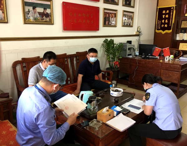 4月28日上午,東鳳鎮(zhèn)市場監(jiān)督管理局譚文平、韋穎欣兩位監(jiān)督員來到東海學校,對學校進行了監(jiān)督檢查,王強校長、后勤處朱鼎針主任、總務處林龍梅主任陪同檢查。