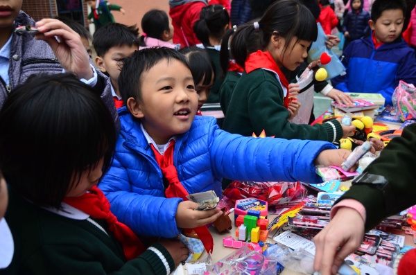活動(dòng)前期,隊(duì)員們慷慨地捐出自己閑置的學(xué)習(xí)用品、書籍、玩具、手工藝品、飾品、個(gè)人書畫作品等來(lái)義賣,各中隊(duì)通過(guò)自主招募,成立了銷售團(tuán)隊(duì)。根據(jù)學(xué)校少工委發(fā)出的倡議,檢查所有的義賣物品是否健康有益,并各出奇謀地制定銷售途徑???,活動(dòng)現(xiàn)場(chǎng),他們紛紛使出渾身解數(shù)熱情地招攬著前來(lái)選購(gòu)的顧客!豐富的展品和興高采烈的師生愛心買家們點(diǎn)燃了整個(gè)校園的熱情。