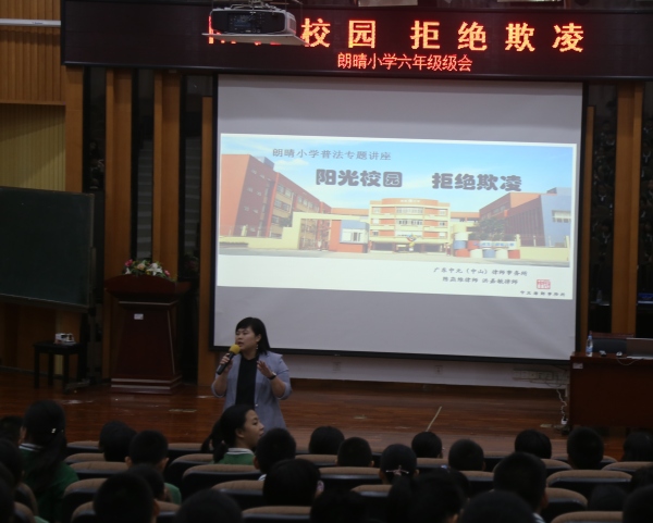 為了營造良好的學(xué)習(xí)氛圍,提高學(xué)生明辨是非的能力,預(yù)防欺凌事件的發(fā)生。9月18下午,東區(qū)朗晴小學(xué)邀請(qǐng)中山市委黨校法律顧問陳燕維律師為六年級(jí)全體師生開展“陽光校園,拒絕欺凌”講座。