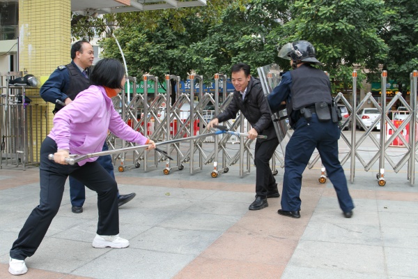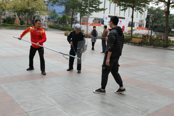 主管學校安保工作的吳潔監(jiān)主任在演練前強調:“如果在校園內遇到歹徒襲擊,安保人員要馬上集合將其制服,值日老師負責疏散學生和報警。”在安保隊長的主持下,安保培訓和演練活動正式開始。學校安全保衛(wèi)隊員先學習相關安保業(yè)務知識,并現(xiàn)場展示講解鋼叉、辣椒噴霧、盾牌、警棍、防割手套等常用防暴器材的功能和使用方法,隨后進行了反恐防暴應急演練。校門口一名“歹徒”手持木棍,想強行闖入校園行兇,安保人員發(fā)現(xiàn)后,在第一時間拉起警報并開啟一鍵報警,另一名保安人員手持盾牌及警棍立即上前阻攔,隨后其他安保人員及時跟進配合,利用警棍、鋼叉等將歹徒制服,整個培訓演練圓滿完成。林華志校長最后進行了總結發(fā)言指出:“校園安全工作重如泰山,安保人員要認真履行崗位職責,定時開展校園巡查,嚴格執(zhí)行校園管理規(guī)定,要切實做好保護學生校園安全的工作,加強全體安保人員的防暴安全演練?!?/p>