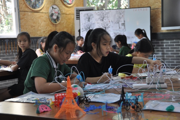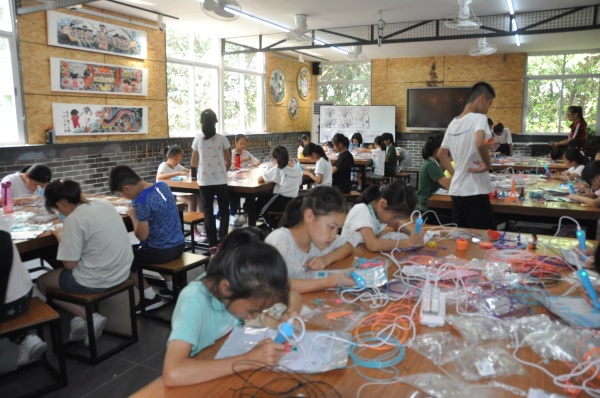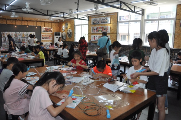 參賽同學(xué)都全神貫注地投入比賽。瞧,這是機(jī)器人現(xiàn)場拼裝賽的同學(xué),他們?nèi)藶橐唤M,在那么多五顏六色的零件中挑選出自己所需材料,現(xiàn)場構(gòu)建一個(gè)模型,多認(rèn)真?。∵@是科學(xué)幻想繪畫賽的同學(xué),他們一會(huì)兒沉思,一會(huì)兒揮筆描邊、涂色,多專注啊!3D涂鴉筆繪畫好特別呀!臺(tái)面一排插座,電線連接下的筆會(huì)噴出繪畫所需材料,然后繪成一幅幅畫,有些畫還是立體的哦!
