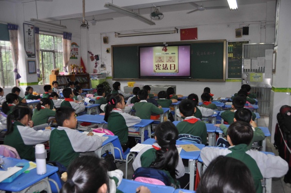 秦律師先讓大家正確認(rèn)識(shí)、看待《憲法》,《憲法》是我國(guó)的根本大法,為讓小學(xué)生能更了解《憲法》,秦律師找來(lái)了視頻。視頻通過(guò)動(dòng)畫(huà)簡(jiǎn)單講述了《憲法》,給大家一個(gè)直觀(guān)的了解。緊接著,秦律師從《憲法》的起源、地位、構(gòu)成、作用等方面來(lái)給大家講述。在同學(xué)們對(duì)《憲法》有一定程度的了解后,秦律師用多個(gè)例子讓大家學(xué)習(xí)運(yùn)用《憲法》保護(hù)自己,特別是受教育權(quán)、姓名權(quán),還介紹了《治安管理?xiàng)l例》、《國(guó)旗法》、《國(guó)徽法》等,十分貼切孩子們的生活。最后秦律師用破壞公物、危害安全等常見(jiàn)的違法行為向大家宣傳法制思想,讓大家心中有法、學(xué)會(huì)用法。