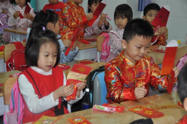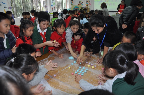 盡管由于雨天關(guān)系,游園活動(dòng)改在室內(nèi)舉行,但是大家興致不減。下午2:40,新年祝福歌曲的旋律在校園上空回蕩,歡快而又激蕩人心的鑼鼓聲又響起,各班的體驗(yàn)活動(dòng)開(kāi)始了,有做糯米糍的、做湯圓的、包餃子的、煎年糕的;做鞭炮、踢毽子、舞龍;寫(xiě)福字、踩高蹺、變臉譜、丟沙包……總之,每個(gè)年級(jí),每個(gè)班級(jí)活動(dòng)各不相同,各具特色。