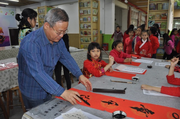 竹苗書(shū)吧里,有書(shū)法特長(zhǎng)的家長(zhǎng)志愿者教孩子們寫(xiě)春聯(lián)。