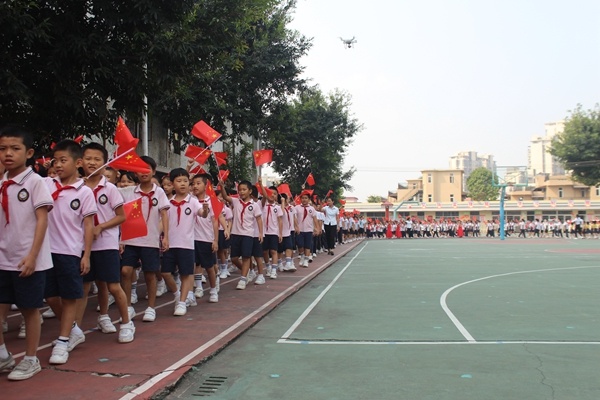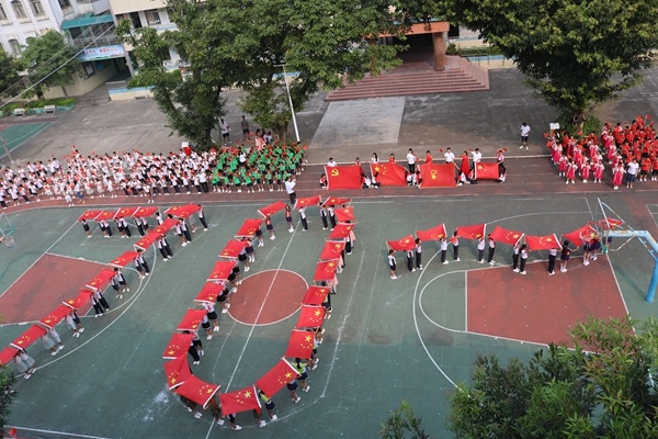 九點(diǎn),快閃活動(dòng)正式開始。教學(xué)樓前,身著禮服的師生八人組成主唱方陣和88人國(guó)旗方陣在教學(xué)樓前已經(jīng)做好準(zhǔn)備,各班師生排在走廊上,面向操場(chǎng)?!拔逍羌t旗迎風(fēng)飄揚(yáng),勝利歌聲多么響亮,歌唱我們親愛的祖國(guó),從今走向繁榮富強(qiáng),歌唱我們親愛的祖國(guó)……”雄壯而熟悉的《歌唱祖國(guó)》旋律響起,點(diǎn)燃了大家的激情,全校師生大聲跟著音樂唱起來,走廊上的同學(xué)們手執(zhí)小國(guó)旗隨音樂節(jié)奏激情揮舞,大家掩飾不住內(nèi)心的激動(dòng)和喜悅。接著在主唱方陣和國(guó)旗方陣的帶領(lǐng)下,身著班服的各班同學(xué)一邊和著《歌唱祖國(guó)》的音樂,一邊緩緩走向操場(chǎng)。整個(gè)校園都洋溢著節(jié)日的氣氛。