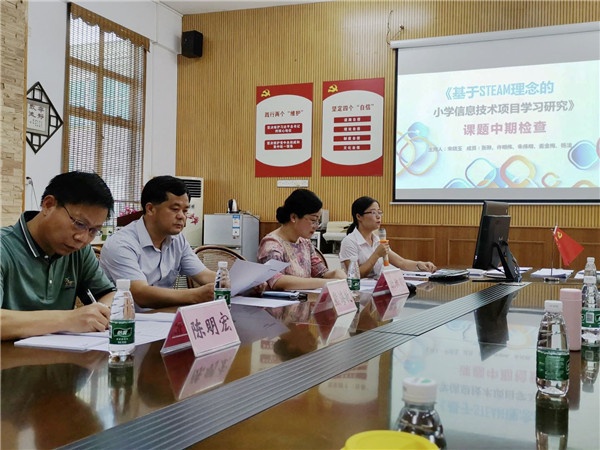 為了對課題的前期研究進行總結診斷,對后期研究進行調整指導,確保課題研究全過程的實效性和規(guī)范性,6月28日上午,中山市東區(qū)雍景園小學召開信息技術學科市級教科研課題《基于STEAM理念的小學信息技術項目學習研究》中期匯報會。雍景園小學誠邀教育部國培計劃專家、廣東省特級教師、市教研室信息技術教研員陳明宏老師,廣東省特級教師、廣東省“特支計劃”教學名師、廣東省名師工作室主持人黃偉祥老師,東區(qū)教育事務指導中心熊海敏副主任作為課題評議專家參加本次報告會。參加此次活動的還有雍景園小學歐淑霞校長、黃玉嬋副校長、劉志博副主任及課題組全體成員。
