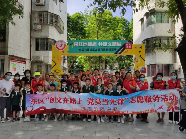 當(dāng)日下午3時(shí),東區(qū)柏苑中心小學(xué)支部書記林小舟帶領(lǐng)黨員教師、部分親子家庭提前來到花苑社區(qū)紅心文化廣場(chǎng)幫助社區(qū)做準(zhǔn)備工作。當(dāng)日艷陽(yáng)高照,天氣炎熱,但大家熱情高漲,忙前忙后,共同為“創(chuàng)文”出一份力。