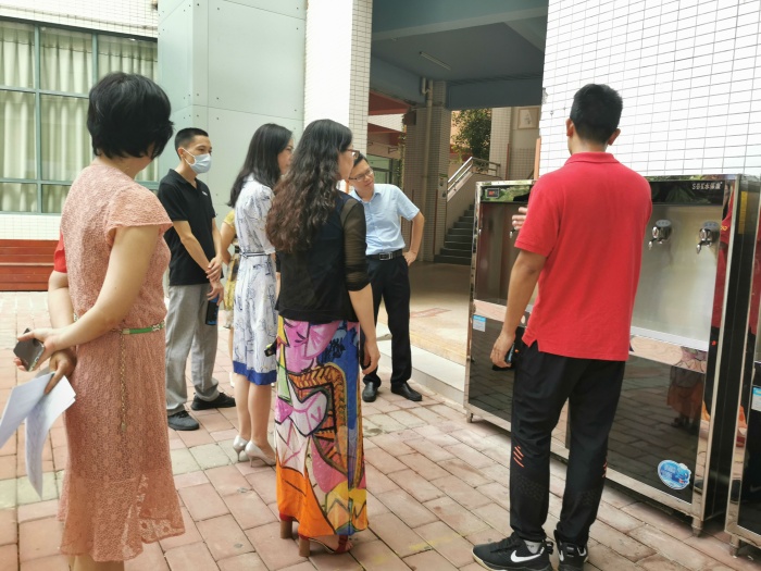 許嵐、熊海敏、盧展紅一行查看了校園環(huán)境布置,重點就新學期學生上學情況、老師人員就位情況、特殊個案生的關注以及學生心理健康、學校食品安全等方面進行了解。在走訪過程中,大家看到校園新進的飲水設備,便進一步就學生飲水健康安全、食品安全問題進行詢問。其中,許嵐主任特地問及了疫情期間飯?zhí)盟筒筒僮髁鞒蹋⒕褪称钒踩珕栴}、從貨源進貨、材料保存與加工、食品制作流程、飯?zhí)萌藛T健康等方面,事無巨細逐一詢問,確保師生安全無虞。