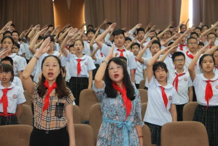 第二部分為一至五年級大隊開展“禮贊中國”慶國慶活動,隊員們和準隊員們通過“紅歌贊祖國、詩歌誦祖國”等環(huán)節(jié),了解祖國歷史,唱出對祖國的熱愛,誦出作為中國人的自豪。