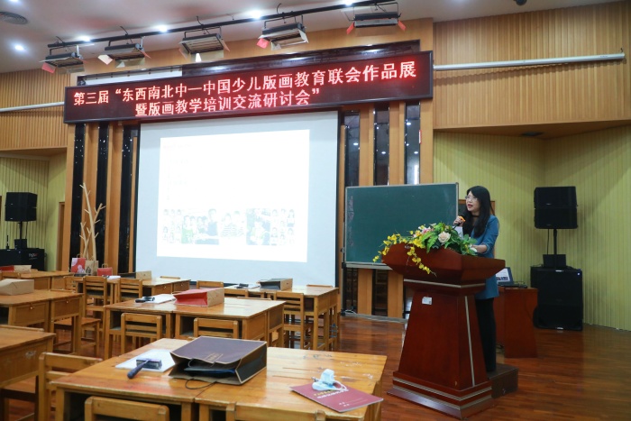 26日,在該校朗言廳內(nèi),珠海容閎學校常務副校長、教育部“國培計劃”美術學科專家常曉冰作題為《通過藝術的教育—喚醒·生命系列藝術課程分析》的主題報告,廣東省特級教師、嶺南少年兒童版畫教育研究會會長王鵬發(fā)表題為《嶺南少兒版畫之“東西南北中”》的講話,東區(qū)街道教育和體育事務中心趙海賓以《東區(qū)美術特色學校建設》為題,介紹了東區(qū)版畫特色項目。