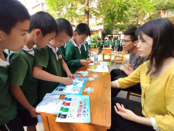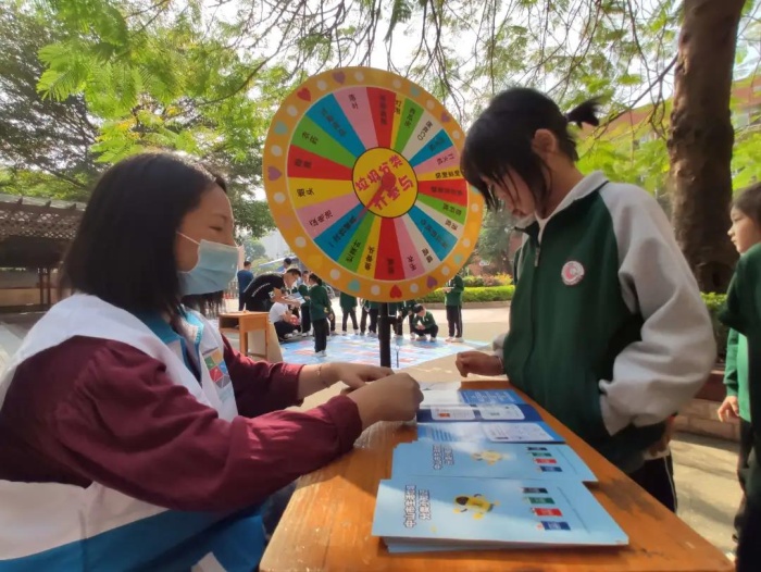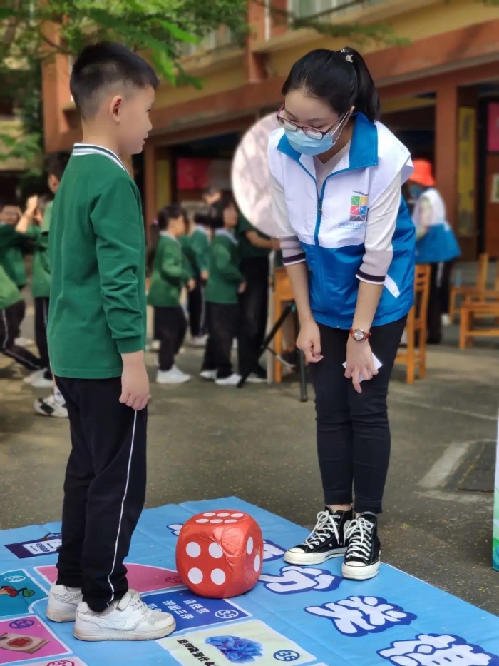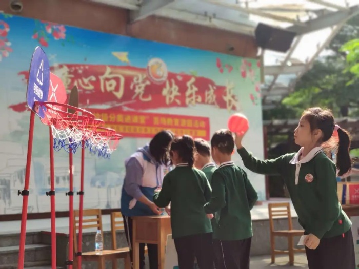 志愿者們以一個(gè)個(gè)垃圾分類(lèi)實(shí)例作導(dǎo)引,向同學(xué)們講解垃圾分類(lèi)的相關(guān)知識(shí),并分發(fā)垃圾分類(lèi)宣傳手冊(cè)。實(shí)踐驗(yàn)真知,蘊(yùn)含垃圾分類(lèi)知識(shí)的趣味游戲?qū)⒒顒?dòng)推向高潮?,F(xiàn)場(chǎng)不僅有益智的“垃圾分類(lèi)大轉(zhuǎn)盤(pán)”“垃圾分類(lèi)模擬投放”“垃圾分類(lèi)有獎(jiǎng)問(wèn)答”,還有動(dòng)腦又動(dòng)手的“垃圾分類(lèi)拼圖游戲”和“垃圾分類(lèi)跳飛機(jī)”“垃圾分類(lèi)投籃”,各種趣味小游戲吸引了同學(xué)們的熱情參與,現(xiàn)場(chǎng)氣氛熱烈,同學(xué)們?cè)谟螒蚧?dòng)中不斷鞏固垃圾分類(lèi)知識(shí)。在“垃圾分類(lèi)有獎(jiǎng)問(wèn)答”游戲環(huán)節(jié),同學(xué)們聚精會(huì)神,根據(jù)志愿者的口令或問(wèn)題,準(zhǔn)確回答垃圾分類(lèi)的問(wèn)題,不僅考驗(yàn)了大家對(duì)垃圾分類(lèi)的了解,也鍛煉了反應(yīng)能力,小朋友們玩得不亦樂(lè)乎。