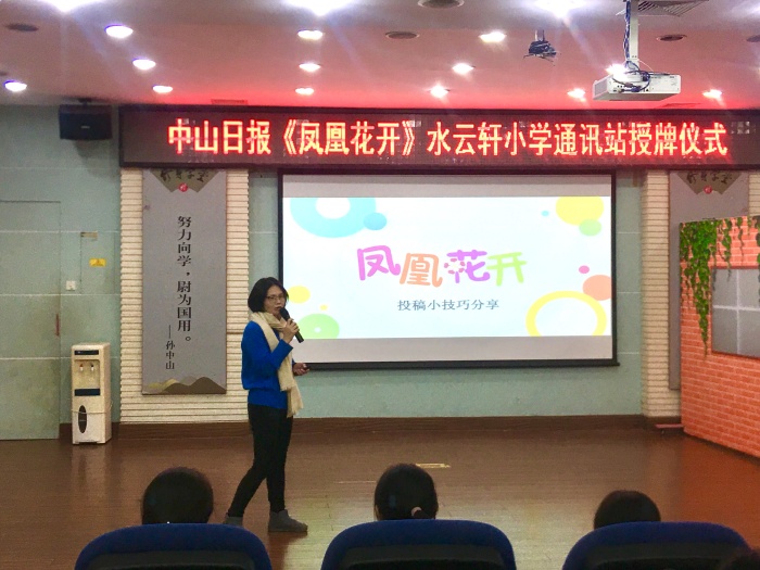 為推動校園精神文明建設(shè),響應廣東省中小學創(chuàng)建“書香校園”活動的號召,豐富學生的校園文化生活,12月17日下午,中山日報《鳳凰花開》校園??瘱|區(qū)水云軒小學通訊站掛牌儀式在多媒體教室舉行?!而P凰花開》校園專刊主編黃漢英為文學社的同學們帶來“《鳳凰花開》投稿技巧知多少”的主題講座。中山報業(yè)傳媒股份有限公司教育工作室總監(jiān)羅展新、《鳳凰花開》校園??瘷谀恐骶廃S漢英、廣東人民出版社中山出版有限公司劉婷婷編輯、校長林小舟、教務處副主任徐雪華出席了本次活動,校文學社全體社員到場聆聽。