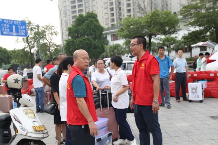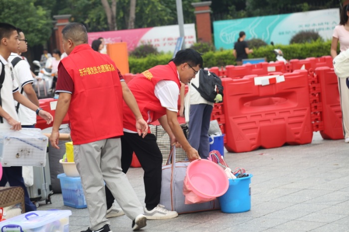 一大早,一輛輛大小汽車(chē)、摩托車(chē)、三輪車(chē),裝著初三同學(xué)及他們大大小小的行李,車(chē)水馬龍般紛至沓來(lái)地涌到了學(xué)校校門(mén)口。東升中學(xué)師生志愿者快速進(jìn)入角色。有疏導(dǎo)車(chē)輛通行的,有快速卸下學(xué)生及行李的,有幫手搬運(yùn)行李入校的。不少黨員老師志愿者身穿紅馬褂忙碌其中,也有不少老師素裝上陣,加上學(xué)生志愿者小黃衣們,他們組成了一道風(fēng)景線(xiàn),讓校園門(mén)口變得溫馨、親切有加。初三的同學(xué),見(jiàn)到老師同學(xué)來(lái)迎,感覺(jué)如回到另外一個(gè)家庭;家長(zhǎng)們見(jiàn)到老師來(lái)接,忙亂的心一下子安定下來(lái)。一件件行李很快地交由老師們從車(chē)上卸下,又一件件地快速由志愿者們運(yùn)進(jìn)校園、運(yùn)到學(xué)生的宿舍。在老師們勸導(dǎo)下,家長(zhǎng)們帶著放心的心情,一輛輛車(chē)輛快速離開(kāi)。就這樣,半個(gè)多小時(shí)的時(shí)間,初三同學(xué)入住學(xué)?;顒?dòng)就基本完成。
