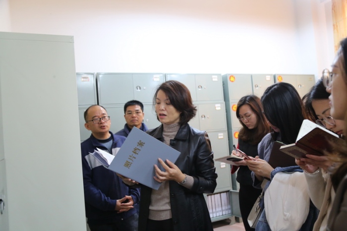 第一階段,與會(huì)活動(dòng)人員集中到東升中學(xué)檔案館進(jìn)行實(shí)物參觀。梁老師就東升中學(xué)檔案布局、實(shí)物陳列以及文本文檔應(yīng)該如何擺放陳列,以及檔案室管理進(jìn)行了現(xiàn)場(chǎng)指導(dǎo)講解。她提醒參觀人員,檔案陳列擺放以及檔案室管理要做到細(xì)致規(guī)范。就各中小學(xué)檔案管理員提出的問(wèn)題,梁老師給予了細(xì)致解答。