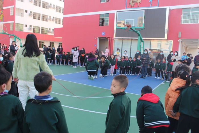 大課間活動中,孩子們排著整齊的隊伍安靜有序地走出教室,進(jìn)入操場,伴著音樂的節(jié)奏整齊有力地完成了隊列隊形、國學(xué)操、跑步操和集體跳繩的展示。家長們手中的手機(jī)不時閃動,更有家長親自身融入到孩子們的活動中,和孩子們共同體驗體育鍛煉的健康和樂趣。