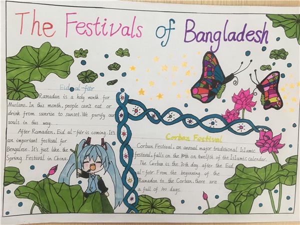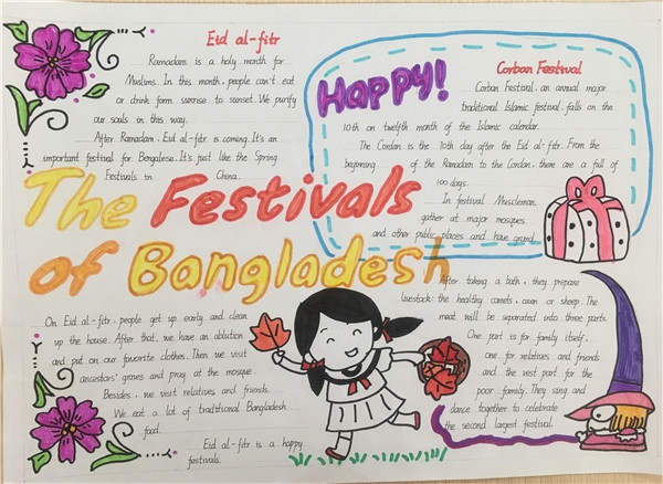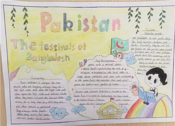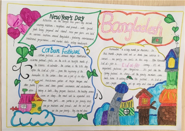每個年級以一個國家的節(jié)日文化為題材繪編手抄報(bào)。三年級手抄報(bào)的主題國家是吉爾吉斯斯坦;四年級是印度;五年級巴基斯坦;是六年級是孟加拉。本次活動讓學(xué)生在充足的時(shí)間內(nèi)完成材料收集、準(zhǔn)備和創(chuàng)作。以學(xué)生自我創(chuàng)作為主,在廣大學(xué)生和英語教師的熱烈響應(yīng)下得以順利開展。