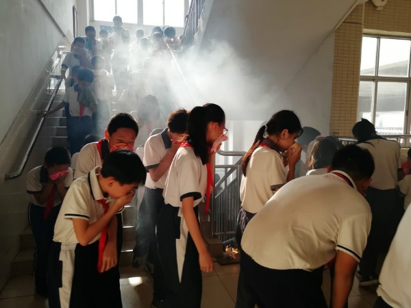 早上8:00,緊急疏散安全演練活動正式開始。隨著一陣急促的警報(bào)聲響起,各班教師按照演練方案的布置,指導(dǎo)學(xué)生們用毛巾捂住口鼻,扶著墻壁、沿著樓梯間的消防安全指示標(biāo)志彎腰半蹲迅速前行。在教師引導(dǎo)下,學(xué)生不推不擠、沉著冷靜、快速有序地從教學(xué)樓撤離。經(jīng)過5分鐘左右的緊急疏散,全校師生全部安全疏散到學(xué)校大操場和籃球場。