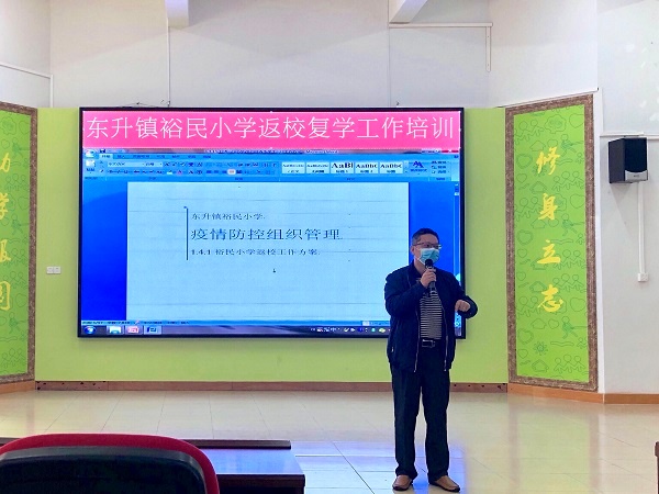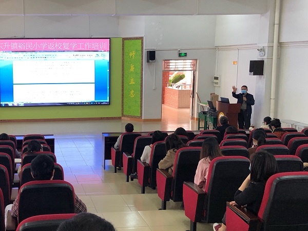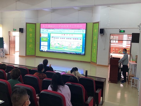 為進(jìn)一步做好學(xué)生返校前的疫情防控各項(xiàng)準(zhǔn)備工作,提高應(yīng)急處理能力,確保學(xué)校開學(xué)工作順利進(jìn)行,4月25日上午,東升鎮(zhèn)裕民小學(xué)在階梯教室開展了東升鎮(zhèn)裕民小學(xué)返校復(fù)學(xué)工作培訓(xùn)活動(dòng)。羅東校長(zhǎng)、溫小玲副校長(zhǎng)、全體行政以及教職工參加了會(huì)議。