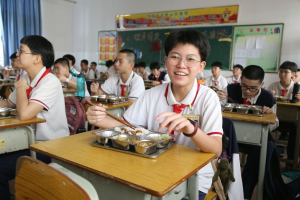 中午11:50是就餐時(shí)間,各班級(jí)學(xué)生在東升中學(xué)行政和部分教師的引導(dǎo)下,以前后1.5米的間隔有序排隊(duì)到一樓架空層領(lǐng)取飯?zhí)锰貍浜酗?,然后再回到班?jí)就餐。為了營造輕松愉快的氛圍,德育處還利用校園電視臺(tái)為大家播放了有趣的電影。
