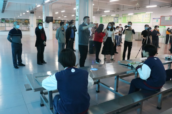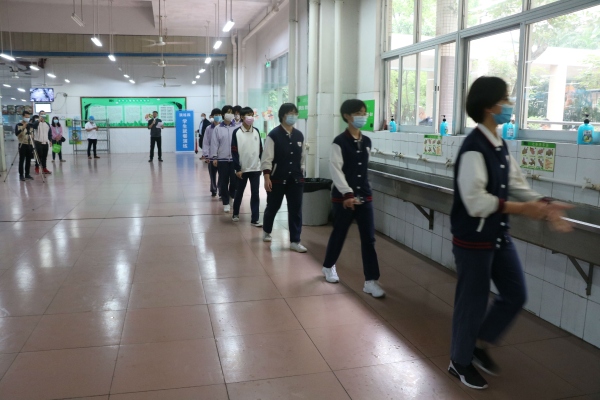 在就餐安排上,東升中學(xué)與東升高中實行錯峰分流制。上午放學(xué)后,由班主任組織本班學(xué)生到飯?zhí)镁筒?。進入食堂前,應(yīng)先至洗手池進行手部清潔,按“七步洗手法”使用洗手液、自來水徹底清潔雙手。洗手后,引導(dǎo)學(xué)生到本班指定位置間隔1.5米就坐,并由雙向四人桌改為單向兩人桌。班主任檢查督促學(xué)生按規(guī)定有序文明就餐。就餐結(jié)束后,學(xué)生依次洗手做好清潔,戴上口罩,統(tǒng)一有序從飯?zhí)煤箝T離開。