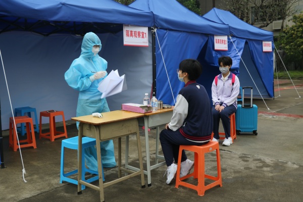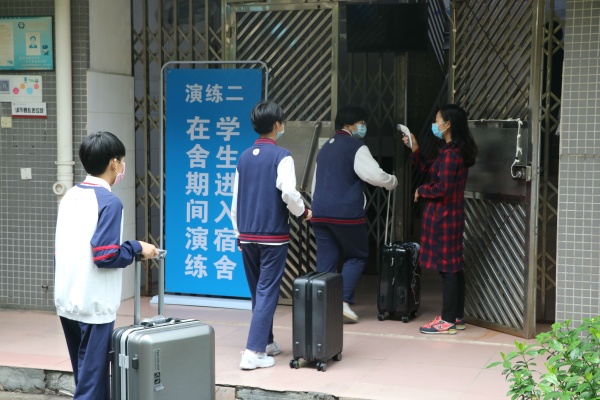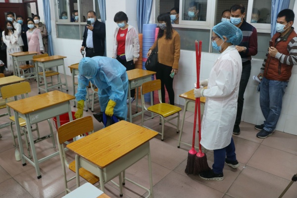 由于兩所學(xué)校的部分學(xué)生是住宿生,宿舍的檢測防控工作也十分重要。為了確保安全,兩所學(xué)校要求住宿生除了洗澡和睡覺之外,其余時間均需佩戴口罩;注重宿舍內(nèi)外的衛(wèi)生保潔工作,不得隨著意離開宿舍。每一天,宿管工作人員均對進入宿舍的學(xué)生進行體溫檢測。如果某一宿舍某個學(xué)生出現(xiàn)發(fā)熱癥狀、咳嗽或嘔吐癥狀,宿舍長將馬上報告宿舍管理員(即“宿管”)。一名宿管第一時間電話聯(lián)系校醫(yī),由校醫(yī)帶學(xué)生到臨時隔離觀察室就醫(yī),全程佩戴口罩;另一名宿管電話聯(lián)系班主任及家長,同時安撫其他學(xué)生情緒。 第二位值班校醫(yī)立即指導(dǎo)宿管人員對宿舍進行消毒工作,所產(chǎn)生的垃圾將單獨特別處理。同時,啟用備用宿舍,將同宿舍的學(xué)生帶到備用宿舍,或者疏散到戶外,待消毒后通風(fēng)30分鐘,學(xué)生再重新進入宿舍。
