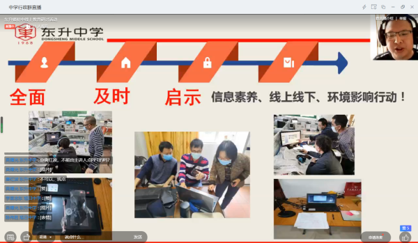 最后,是由東升中學(xué)教導(dǎo)處唐紅波主任作題為《因勢(shì)而謀,應(yīng)勢(shì)而動(dòng),順勢(shì)而為》的工作經(jīng)驗(yàn)介紹,為全體與會(huì)人員介紹了東升中學(xué)一個(gè)月以來(lái)線上教育的實(shí)踐情況、經(jīng)驗(yàn)總結(jié)和理性思考。唐紅波主任的講話可以歸結(jié)為四個(gè)關(guān)鍵詞:全面、及時(shí)、啟示、反思?!叭妗保环矫嬷傅氖窃跂|升中學(xué)校長(zhǎng)辦公會(huì)議精神的引領(lǐng)下,東升中學(xué)全體教師都積極參與。另一方面,指的是火力全開(kāi),全面貫徹上級(jí)指示精神,不僅美術(shù)、音樂(lè)、體育如數(shù)開(kāi)足課程,而且還開(kāi)設(shè)了班會(huì)課和心理輔導(dǎo)課?!凹皶r(shí)”指的是對(duì)存在的問(wèn)題進(jìn)行最迅速的“響應(yīng)”,并在最短的時(shí)間內(nèi)拿出行之有效的辦法?!皢⑹尽本褪巧朴趶募?xì)微的工作中發(fā)現(xiàn)有利于促進(jìn)工作開(kāi)展的新契機(jī)新智慧,以及善于發(fā)現(xiàn)工作中所不易為大家所知道的感動(dòng)人心的力量。如東升中學(xué)的老教師李立根、劉燕霞、麥華添、聶倩影等,為了更好地進(jìn)行線上教學(xué),不僅購(gòu)買了新電腦和相關(guān)設(shè)備,還多次向同事請(qǐng)教線上教學(xué)的具體操作?!胺此肌敝傅氖巧朴诳偨Y(jié)歸納,不斷改進(jìn)。比如,在線上教育開(kāi)展的這段時(shí)間以來(lái),東升中學(xué)的宣傳工作還有待加強(qiáng),微課資源庫(kù)還有待充實(shí)。