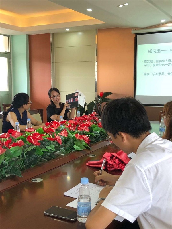 首先,蔣校長(zhǎng)從課題的選題依據(jù)、研究框架、思路方法、創(chuàng)新之處等方面給音樂教研組成員作了生動(dòng)詳盡的介紹。在分享過(guò)程中,就課題命名的界定、關(guān)鍵詞的提取及分析方法的關(guān)聯(lián)性等問(wèn)題,教研組成員與蔣校長(zhǎng)進(jìn)行了熱烈而深入的討論。