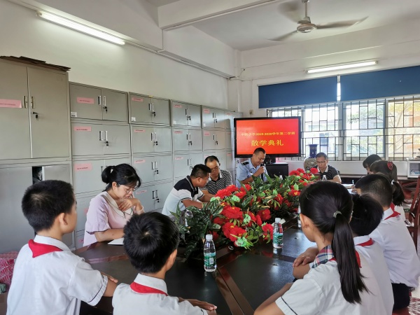 上午八點整,散學禮如期開始。由于當天的高溫預警,為了學生們的健康和安全,散學禮主會場設在了學校會議室,各班教室為分會場,每班派一名學生代表在會議室出席散學典禮。同學們精神昂揚,帶著期待又緊張的心情認真聽講。暑假將至,安全第一。首先,豐聯(lián)小學法治副校長林慶初警官給同學們進行了假期安全教育,包括防火防盜防詐騙等等,特別提醒了防溺水和防疫的注意事項。林警官強調,安全無小事,生命是最寶貴的,希望同學們認真遵照執(zhí)行,過一個愉快又安全的暑假。