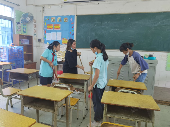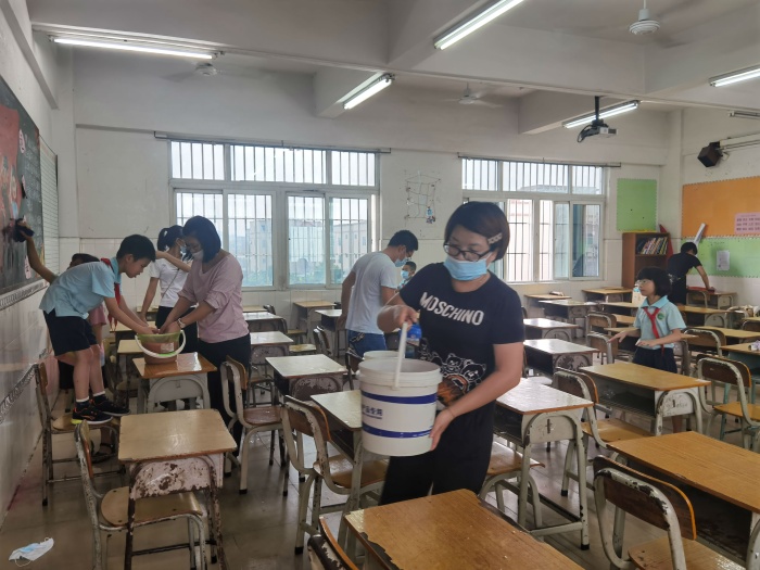 烈日炎炎,卻也擋不住每個班級的家長志愿者積極參與的熱情。家長和孩子們在班主任老師的帶領(lǐng)下來到新班級,二話不說,擼起袖子直接干活。孩子們拿著水桶接了水,開始把課室的桌椅擦干凈,還主動擦門框窗框等。家長和老師們也沒有閑著,個子高的家長取下窗簾,清除天花板的衛(wèi)生死角,大家相互配合,分工合作。孩子們做完力所能及的班務(wù)后,又主動幫助大人們干活。在這種熱火朝天的氣氛中,原本落滿塵灰的課室此時已煥然一新,墻壁、地面重新恢復了光潔明亮;窗簾也散發(fā)著清新的香氣;雜亂無章的課桌椅擺放得整整齊齊。看著窗明幾凈的教室,大家臉上不約而同地露出了笑容。