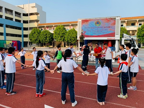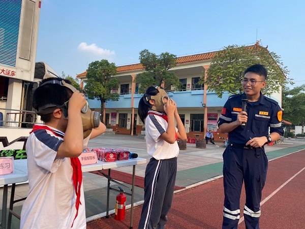 接下來,學(xué)校邀請廣東省595安全科技有限公司培訓(xùn)人員進行防空防災(zāi)體驗式宣傳活動,培訓(xùn)人員邊講解邊指導(dǎo)學(xué)生體驗了消防帳篷逃生、手搖報警器操作、防毒面具試戴、模擬觸電等場景。在這種互動式體驗和宣講下,學(xué)生們興致盎然,積極參與活動,既獲得了安全知識教育,又獲得了應(yīng)急操作經(jīng)驗。消防演練是眾多演練中必不可少的環(huán)節(jié),培訓(xùn)人員講解和示范了滅火器的使用后,部分師生按照事先安排,現(xiàn)場展示了滅火器滅火操作。