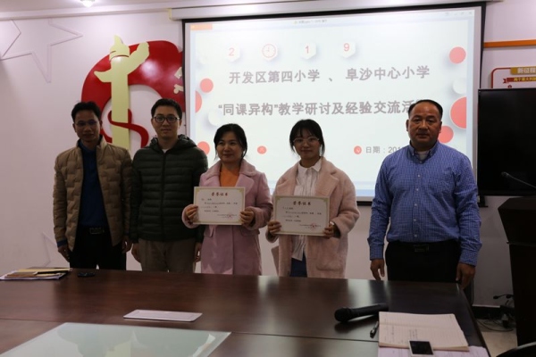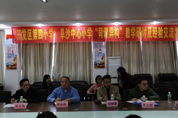 同課異構,協(xié)同并進!為了促進教師專業(yè)成長和數(shù)學科組建設與發(fā)展,2019年12月3日,阜沙中心小學數(shù)學組與開發(fā)區(qū)第四小學數(shù)學組共同在開發(fā)區(qū)第四小學開展同課異構教學研討及經(jīng)驗交流活動。出席活動的有兩校的校長梁業(yè)昌、鄭碩果,開發(fā)區(qū)中心教研組成員張立超以及兩校全體數(shù)學老師。