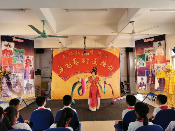 本年度的粵劇藝術(shù)進(jìn)校園活動(dòng)在全市范圍內(nèi)的中小學(xué)開展,主題為“南國(guó)紅豆展芳華”。10月21日上午,粵劇藝術(shù)進(jìn)校園活動(dòng)走進(jìn)了阜沙鎮(zhèn)豐聯(lián)小學(xué)。當(dāng)舞臺(tái)在朗朗書聲中搭起,各班同學(xué)們?cè)诎嘀魅蔚慕M織和帶領(lǐng)下有序齊聚在階梯室,觀看精彩、難得的粵劇藝術(shù)節(jié)目。節(jié)目一開始,主持人給同學(xué)們普及了粵劇知識(shí);緊接著,同學(xué)們帶著新奇的粵劇知識(shí)興致勃勃地賞析了折子戲:《巾幗英雄》、旦行身段展示:《天女散花》 、“扇子舞”表演等精彩典型的粵劇藝術(shù)。欣賞表演過(guò)后,在表演老師的邀請(qǐng)下,同學(xué)們紛紛發(fā)表自己對(duì)戲曲的理解和粵劇藝術(shù)的感受,同時(shí)還向表演老師主動(dòng)請(qǐng)教了關(guān)于粵劇藝術(shù)表演的問(wèn)題?,F(xiàn)場(chǎng)氣氛非?;钴S,活動(dòng)在互動(dòng)的高潮中圓滿落幕。