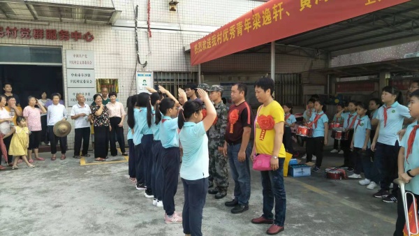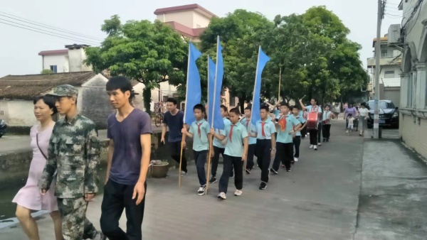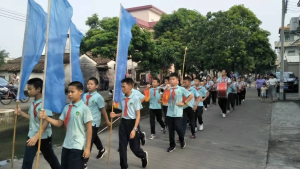 2019年9月12日,潤紅的嬌陽為晴天添加了一抹色彩。牛角小學(xué)小學(xué)的鼓號(hào)隊(duì)員滿懷激情地來到阜沙鎮(zhèn)牛角村和衛(wèi)民村村府參加送軍儀式。