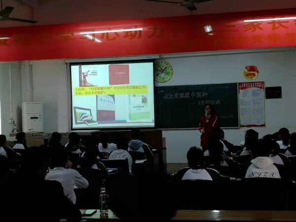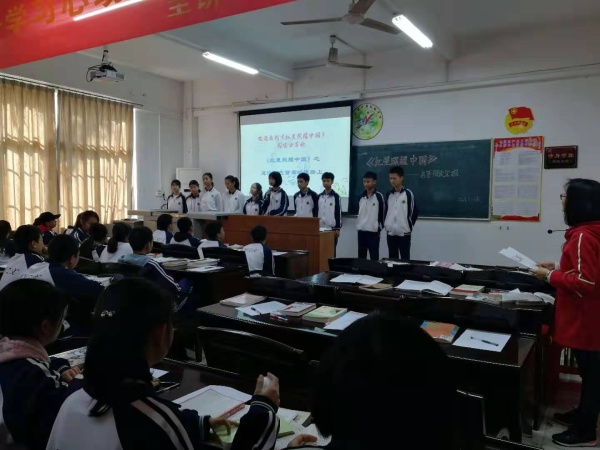 教研活動(dòng)首先由牛角中學(xué)易曉軍老師執(zhí)教《紅星照耀中國(guó)》名著閱讀課。經(jīng)過充分的準(zhǔn)備,在學(xué)生深入閱讀的基礎(chǔ)上,易曉軍老師創(chuàng)造性地為我們呈現(xiàn)了一堂以學(xué)生為主體的名著閱讀匯報(bào)課。易老師緊緊抓住“將厚的書都薄,將薄的書讀厚”的理念,通過專題分類,巧妙地引導(dǎo)學(xué)生將看似枯燥無味的內(nèi)容,有條理,有趣味地運(yùn)用小組合作共讀的方式去閱讀下來,并通過各具特色的方式,如情景劇、演講等進(jìn)行小組的閱讀匯報(bào)。在整個(gè)過程中,學(xué)生表現(xiàn)出強(qiáng)烈的積極性,獲得滿滿的參與感,將一開始內(nèi)心恐懼、看不懂的內(nèi)容,一步一步變得可以接受,甚至有了濃厚的興趣。名著閱讀這塊“難啃的石頭”也慢慢成為學(xué)生成長(zhǎng)的墊腳石。