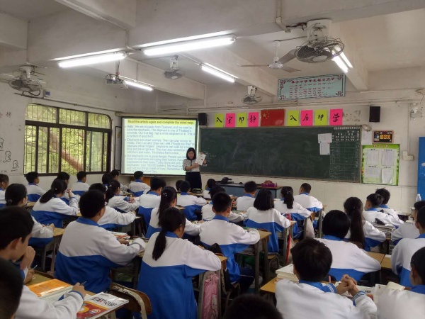 首先,由牛角中學(xué)楊文炎老師在阜沙中學(xué)借班上課,展示了一節(jié)課改項(xiàng)目主題為《通過(guò)情境活動(dòng)提高初中英語(yǔ)教學(xué)有效性》的示范課。全體英語(yǔ)老師及教研員參與了聽(tīng)課活動(dòng),并做了視頻錄制。本節(jié)課的教學(xué)內(nèi)容是人教版Go for it 七下《Unit 5 Why do you like pandas?》的閱讀課。楊老師在閱讀課的導(dǎo)入環(huán)節(jié)靈活運(yùn)用了利用隱性閱讀素材激發(fā)英語(yǔ)學(xué)習(xí)興趣的方法,將課堂教學(xué)自然過(guò)渡到閱讀文章《Elephants in Thailand》的學(xué)習(xí)。在閱讀教學(xué)環(huán)節(jié),楊老師穿插了談?wù)摯笙蟮哪芰σ约霸谌祟惾粘I钪兴鸬淖饔玫那榫郴顒?dòng),幫助學(xué)生更加真實(shí)地進(jìn)行口語(yǔ)訓(xùn)練。并成功地把“提倡人與自然和諧共處,呼吁大家保護(hù)野生動(dòng)物和生態(tài)環(huán)境”的情感教學(xué)目標(biāo)灌輸其中。