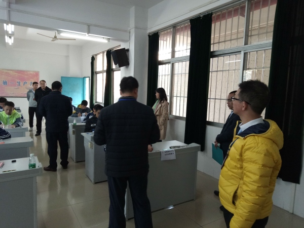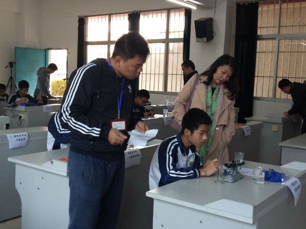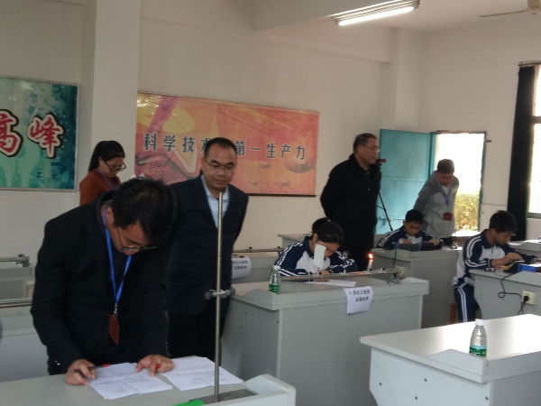 考試過程中,首先是學(xué)生自己抽簽抽取考試的題目,由教指中心領(lǐng)導(dǎo)的評委小組進行監(jiān)考。學(xué)生們有條不紊的抽簽,并且熟練而規(guī)范的進行考試。期間,中山市巡考組的領(lǐng)導(dǎo)陳源斌,邱慎明,鄧明潔對牛角初級中學(xué)的實驗考核進行了巡視。并且肯定了實驗考核工作到位,有序,還交流了對初中物理實驗考核的一些意見。