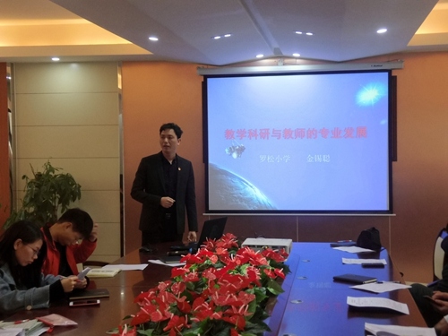 活動由金錫聰主任主持并主講?!盀槭裁次覀兊膶W(xué)校總是培養(yǎng)不出杰出人才?”活動伊始,金主任拋出問題,引發(fā)全體培訓(xùn)人員的思考。金主任再以一個有趣的故事——動物創(chuàng)建學(xué)校,道出學(xué)校培養(yǎng)不出杰出人才的緣由——缺乏挖掘?!澳悴簧险n,就不是老師;你不搞科研,就不是好老師”。引用“中國近代力學(xué)之父”錢偉長的話,金主任闡明了教學(xué)科研的重要性。他指出,當今絕大多數(shù)教師的弊?。翰蛔x書、不合作、不研究,這也成為提升教師專業(yè)發(fā)展的障礙。接著,金主任從“教師為什么要搞教學(xué)科研?”、“為什么要講教師的專業(yè)發(fā)展?”、“教學(xué)科研=課題研究?”、“怎樣的教學(xué)科研更有利于教師的專業(yè)成長?”、“教師專業(yè)成長的保障:幸福善好生活的營建”六個方面詳細論述教學(xué)科研與教師專業(yè)發(fā)展的關(guān)系。
