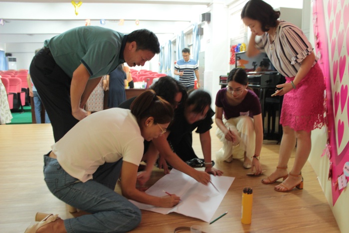 首先是破冰環(huán)節(jié)。明哲老師帶領(lǐng)全體成員進(jìn)行一個(gè)熱身——跳拍拍操?;顫姷囊魳?lè)加越來(lái)越快的節(jié)奏,老師們的熱情頓時(shí)高漲起來(lái)了,現(xiàn)場(chǎng)笑聲一片。