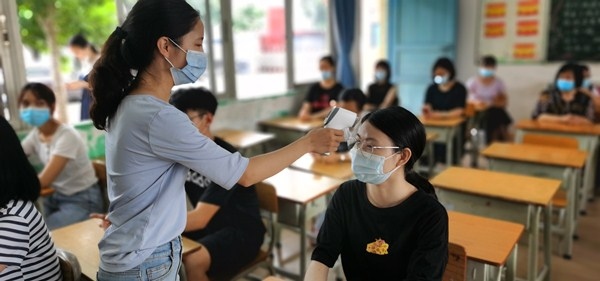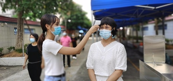 演練主要分為兩個(gè)環(huán)節(jié)。第一環(huán)節(jié),教師們扮演學(xué)生,戴好口罩,間隔1米,排好隊(duì),錯(cuò)峰等候入校。進(jìn)校前,接受體溫檢測(cè),體溫正常則直接進(jìn)入校園。當(dāng)體溫異常時(shí),檢測(cè)員報(bào)告值日行政,并將其帶到隔離區(qū),由隔離區(qū)的校醫(yī)監(jiān)管,同時(shí)聯(lián)系班主任,由其通知家長(zhǎng)接走,疫情防控小組負(fù)責(zé)人根據(jù)實(shí)際情況反饋信息到相關(guān)部門(mén)。最后消毒人員對(duì)相應(yīng)區(qū)域進(jìn)行消毒。第二環(huán)節(jié),上課期間,如果有學(xué)生感到不舒服,任課教師對(duì)其進(jìn)行體溫檢測(cè),確定體溫異常的,將其帶到樓道空曠處并報(bào)告班主任及校醫(yī),由校醫(yī)將該生帶到隔離觀察室觀察,做好三次檢測(cè),并登記相關(guān)信息匯報(bào)疫情防控領(lǐng)導(dǎo)小組,由小組負(fù)責(zé)人撥打120等候處置。接著,班主任將其他學(xué)生轉(zhuǎn)移至備用教室,并做好學(xué)生安撫工作。