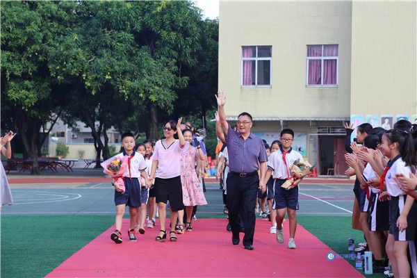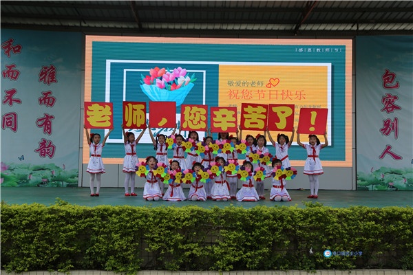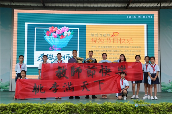 濃濃尊師意,感恩教育主題活動。9月10日早上,全校師生集中到操場進行了“感謝師恩”主題活動。情系教師,愛滿校園,師生共走紅毯,鮮花簇簇感師恩。美妙的音樂聲中,老師們牽著孩子的手走過紅地毯走上舞臺,并接受學生們的獻花、敬禮與祝福。今天,老師們是最美的主角。隨后,李校長在活動上向全體教師致以節(jié)日問候,希望全體老師牢記教育使命、不忘育人育才初心,勉勵老師們辛勤耕耘,發(fā)揚民主精神,攜手共創(chuàng)更輝煌的明天。“靜靜的深夜群星在閃耀,老師的房間徹夜明亮……”羅樊老師和同學們帶來朗誦和書法表演《師恩似海 桃李芬芳》。同學們聲情并茂,聲聲洪亮,句句動情,以自己的方式表達了對老師的愛和感激。舞蹈隊的孩子們以一首歡樂的舞蹈向老師們獻禮。頓時,清晨的校園里充滿了濃濃的節(jié)日氣氛。最后,全校師生一起唱響《聽我說,謝謝你》,整個活動推向了最高潮。