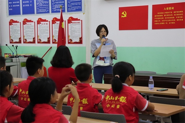 在儀式中,中山日報《鳳凰花開》校園??骶廃S漢英致辭,她向同學們介紹了成立小記者站的目的和意義,同時希望小記者們用眼睛觀察事物、用筆記錄見聞,從小記者的角度去認識和記錄世界,也期待小記者們能走出校園、走進社會,在實踐活動中鍛煉自己的膽識與勇氣,用自己獨特的視角,發(fā)現(xiàn)一切值得記錄的精彩瞬間。接著,中山報業(yè)傳媒股份有限公司教育工作室總監(jiān)羅展新女士向學校蘇少麗校長授牌,蘇校長表示,今后將充分發(fā)揮小記者站這一平臺的作用,激發(fā)學生寫作的興趣,她希望同學們在活動中能做到勤于觀察、善于思考,增長見聞,增強社會責任感。