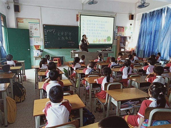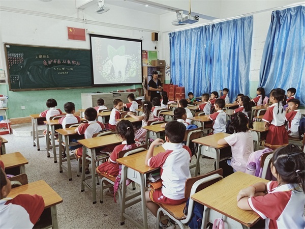 當天的升旗儀式上,學校大隊委曾凡苑老師進行了主題為“愛牙護牙,從小做起”的國旗下講話,曾老師提醒同學們在享受快樂生活的同時,別忘了關(guān)注自己的口腔健康,號召同學們要積極行動起來,努力做到從小愛牙護牙,擁有一副健康潔白的牙齒。下午,學校組織了低年級的班級開展了一次“愛牙護牙”主題班會課,班會課上,根據(jù)一年級學生正處于換牙階段,班主任們向同學們介紹了換牙期間的注意事項,并通過故事、小游戲、圖片和視頻等形式向同學們講述了牙齒的構(gòu)成及其作用。以“全國愛牙日”為契機,針對齲齒帶來的危害,班主任們還介紹了保護牙齒的方法,有效地宣傳了如何預(yù)防齲齒、減少口腔疾病,讓孩子們更好地保護自己的牙齒。此外,學校還利用張貼宣傳展示欄圖片的形式引導(dǎo)學生早晚正確刷牙,幫助孩子們養(yǎng)成良好的生活衛(wèi)生習慣。
